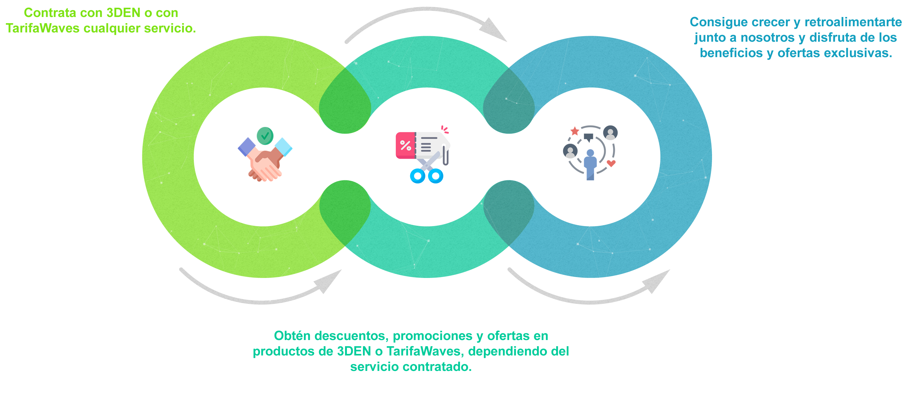 Contratando cualquier servicio con 3DEN o con TarifaWaves y dependiendo de cual sea este, obtendrás ofertas, promociones y descuentos en servicios de la otra empresa. 3DEN y TarifaWaves van de la mano y apuestan por la colaboración para crecer juntos.